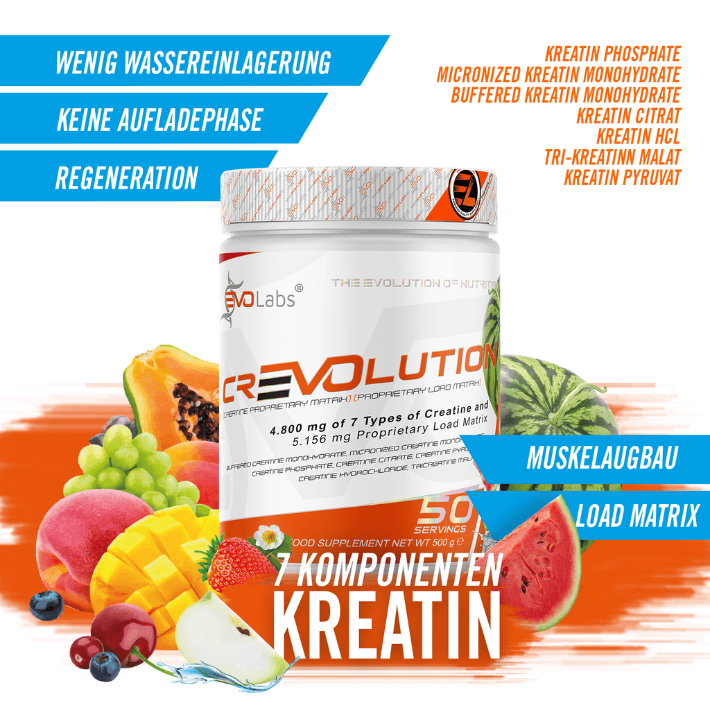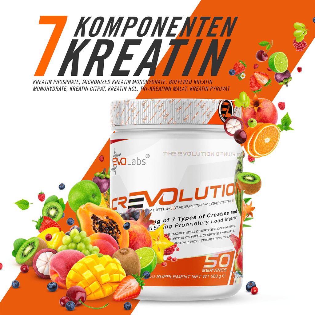 Crevolution ist ein wahrer, strategisch auf high Performance ausgelegter Breitband Kraftstoff für deine Zellen! Da jeder Körper auf unterschiedliche Kreatin Formen anspringt, haben wir für alle Vorraussetzungen vorgesorgt, so dass keine Wünsche mehr offen bleiben. So haben wir mit Crevolution die optimale Wirkstoffkombination aus 7 Kreatin Komponenten bestehend aus: Kreatin Phosphate, Micronized Kreatin Monohydrate, Buffered Kreatin Monohydrate, Kreatin Citrat, Kreatin HCL, Tri-Kreatinn Malat, Kreatin Pyruvat für dich zusammengestellt, die jede Anforderung abdecken sollte. Eine maximale Abdeckung kann für extremen Kraftzuwachs und Muskelpump sorgen. Es sind keine wöchentlichen Ladephasen mehr nötig.