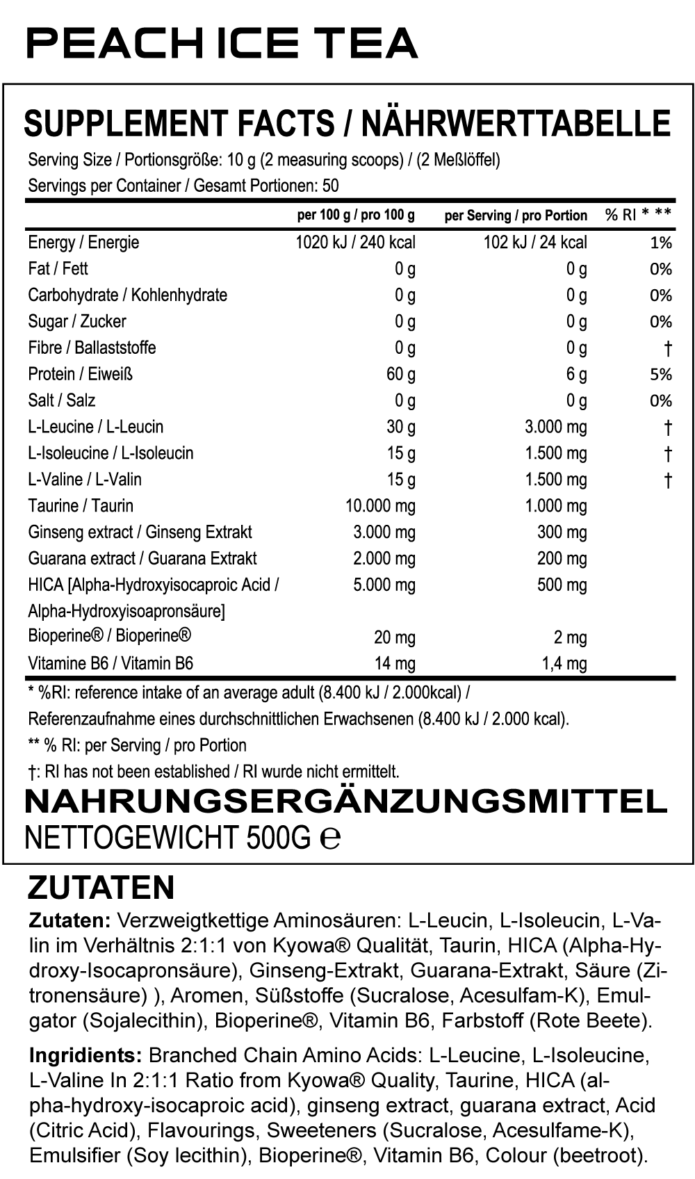 Guarana, Taurin und Ginseng sorgen beim Training für ein optimales Energie und Fokuslevel! Das macht unser Produkt zu einem perfekten Premium Intraworkout Produkt!