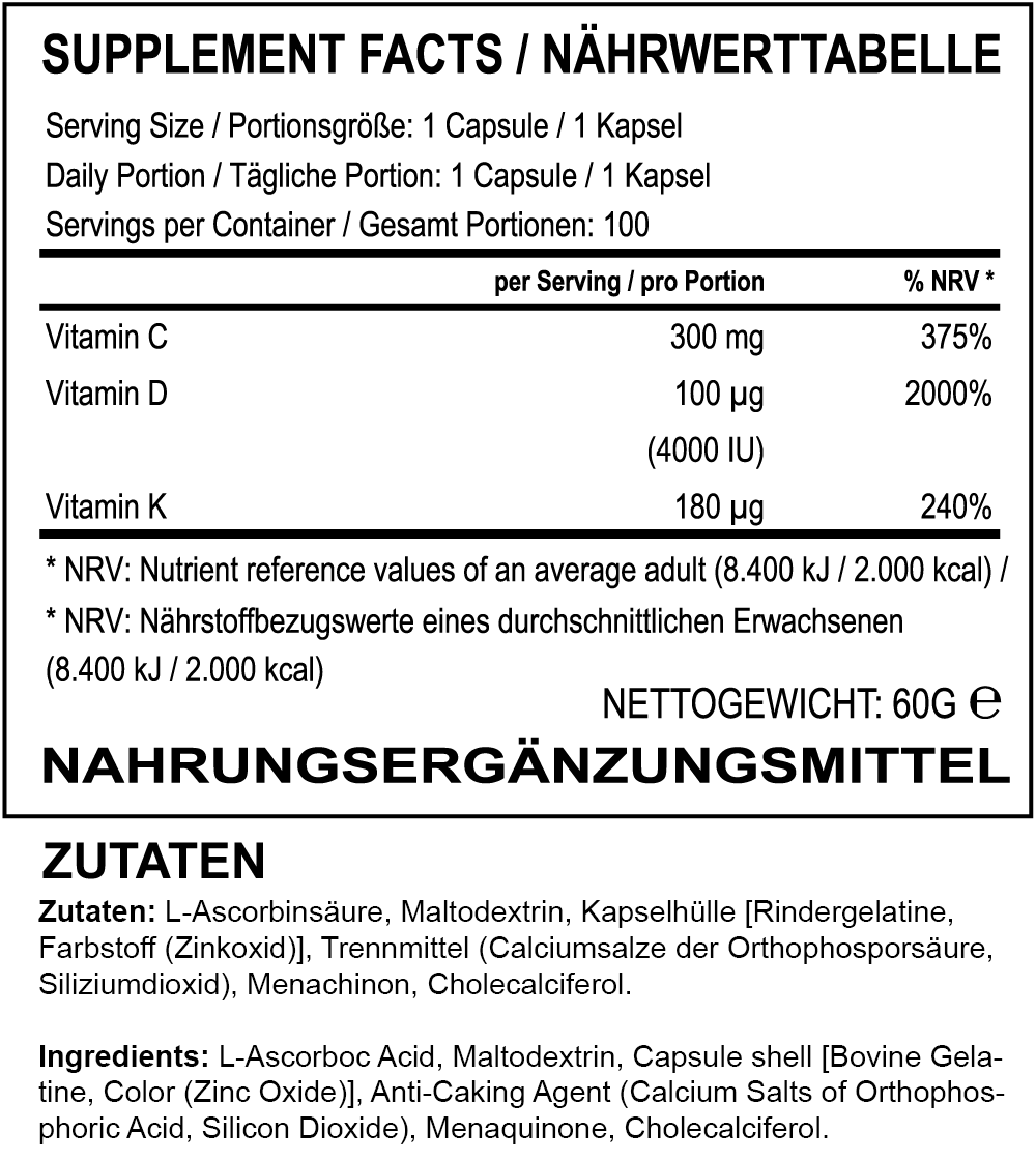 Ebenso ist hochqualitatives Vitamin C enthalten, was die Aufnahme von Vitamin D3 plus K2 deutlich verbessern kann. Dazu Hilft Vitamin C bei der Unterstützung des Immunsystems und ist ein Radikalfänger (reduziert Entzündungsprozesse im Körper) und ist somit ein wichtiges Vitamin, das in unserem gut durchdachten Produkt natürlich nicht fehlen darf!